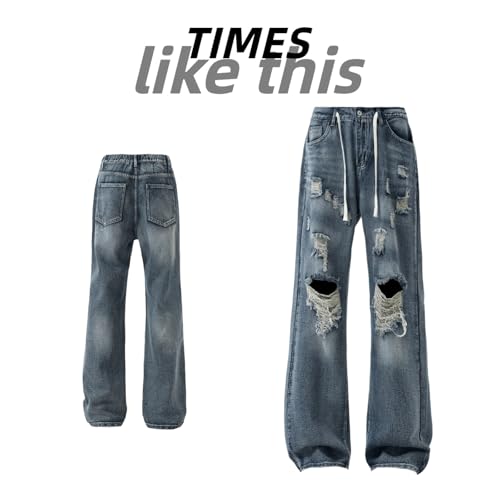 HOT ! Men’s Baggy Ripped Jeans Distressed Wide Leg Denim Pants with Drawstring Waist Destroyed Holes Streetwear Style