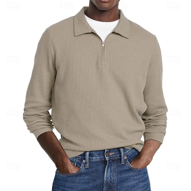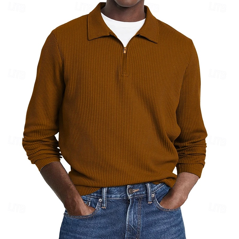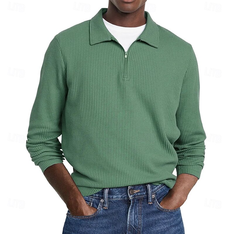 HOT ! Men's Waffle Polo Shirts Street Casual Zip Lapel Long Sleeve Basic Modern Plain Textured Buttons Spring Fall Black White Red Navy Blue Purple Brown Waffle Polo Shirts
