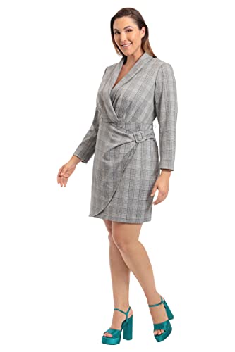 • Surplus bodice with lapel collar V-neck, long sleeves, suit-look dress, waist seam, gathering at skirt overlay with fabric covered rectangular buckle, and an above the knee length faux wrap look skirt.