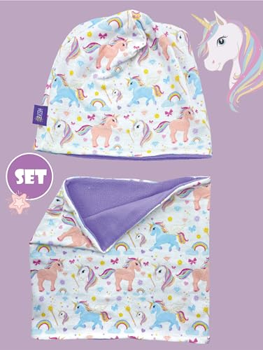 Unicorn Kids Girls Beanie Hat & Loop Scarf Set - with Fleece - 95% Cotton - Soft & Easy Care Stretch Material 1