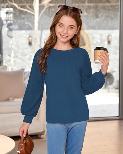 Girls Puff Long Sleeve Shirts Ribbed Knit Fall Blouse Pleated Solid Casual Tunic Top 6-14 Years 4