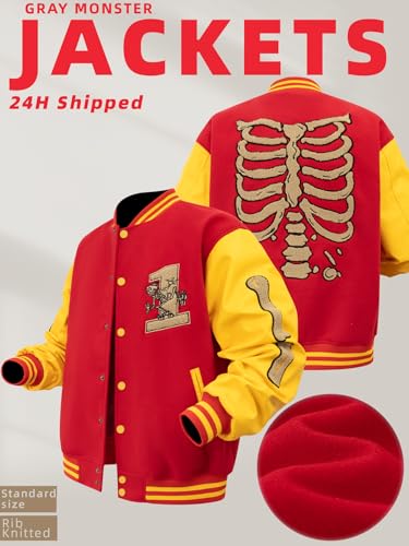 Fabric type: 100% PolyesterCare instructions: Hand Wash OnlyOrigin: Imported❤️❤️【Cool Halloween Jacket】Crafted from 100% polyester with faux leather sleeves, this men's varsity jacket blends durability and Halloween-ready style. superb for showcasing bold seasonal flair!❤️❤️【Fashion Design】Features snap-button closure and ribbed cuffs/hem for a secure fit. Detailed skull embroidery on the back adds a spooky yet fashionable touch.❤️❤️【Fashion Vibrant Colors】Stand out with vibrant purple, red, or black options—each designed to complement your Halloween costumes or casual streetwear looks.❤️❤️【Versatile style】Versatile enough for parties, trick-or-treat events, or daily wear. Pair with jeans or costumes for an effortlessly cool outfit.❤️❤️【Perfect Gift for Men】An ideal Halloween gift! This trendy jacket combines holiday spirit with timeless design, making it a standout pick for the season.