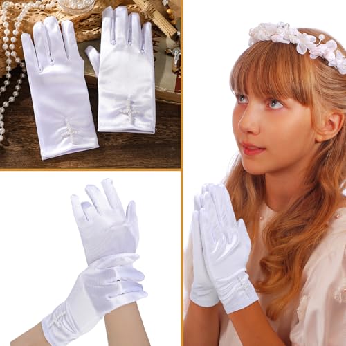 First Communion Accessories for Girl and Boy Cross Gloves with Beaded White Satin Gloves with Rhinestone Religion Gift for First Holy Communion Birthday Party 1
