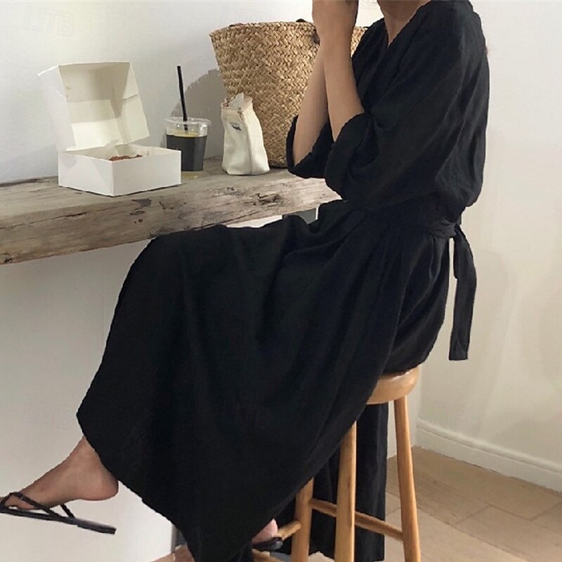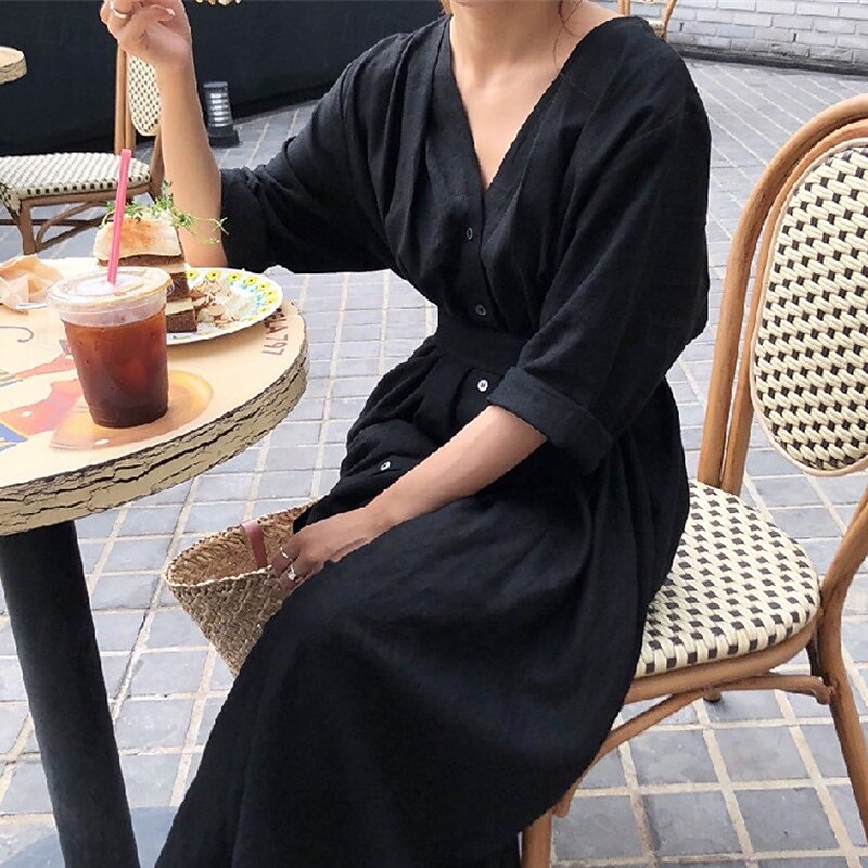 Women's Long Dress Maxi Dress Linen-Inspired Dresses White Dress Casual Dress Stylish Casual Vacation Daily Date Regular Fit Plain Long Sleeve V Neck Black White Summer Spring 11