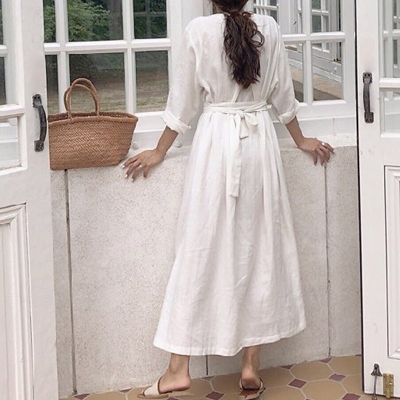 Women's Long Dress Maxi Dress Linen-Inspired Dresses White Dress Casual Dress Stylish Casual Vacation Daily Date Regular Fit Plain Long Sleeve V Neck Black White Summer Spring 7