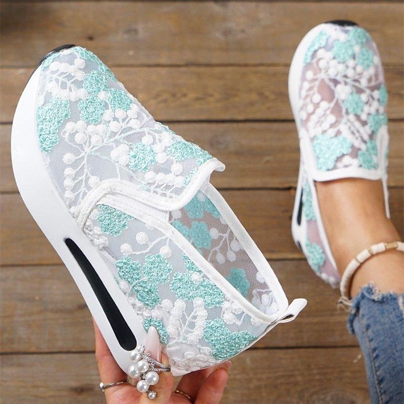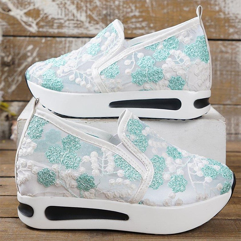 Highlights [Fabric] These elegant women's sneakers are crafted from a transparent mesh fabric, intricately embellished with floral embroidery that combines faux leather, giving a sophisticated and feminine touch to your casual wear. The breathable material ensures comfort during warm spring and summer days. [Cut/Shape] Designed with a comfortable platform and wedge heel, these sneakers provide both height and stability. The round toe shape complements a wide range of outfits, enhancing the overall casual chic look. [Design Highlights] Featuring an elegant lace detail in soft white and mint green, these slip-on sneakers incorporate a distinctive cut-out design. The elastic side panels make them easy to wear while offering a secure and flexible fit. [Occasions] Ideal for daily activities such as walking, these sneakers are perfect for casual outings and summer events. Their contemporary style combined with comfort makes them a versatile choice for pairing with jeans, skirts, or dresses, suited for the modern woman on the go. [Size Notice] Available in a variety of sizes, these sneakers range from US5.5 to US10, accommodating various preferences. It is suggested to select one size larger than usual for the best fit and comfort.