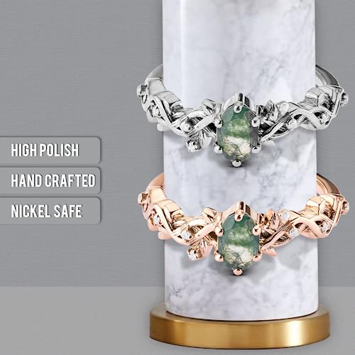 • FEATURES : Exquisite Moss Agate Engagement Ring for Women, Hand Crafted in Solid 925 Sterling Silver with White or Rose Gold Two Rhodium Plating Colors. Meticulously Detailed with Floral Leaf Vine Design, Center Oval Cut Natural Moss Agate Stone Inlaid in 6 Prongs and Small Round White AAA Cubic Zirconia. This Ring Represents Purity and Beauty of Nature. Moss Agate is Strong Enough to be Worn Daily and Makes an Excellent Choice for an Engagement Ring.