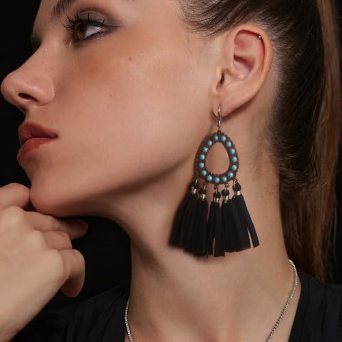 Long Bohemian Fringe Leather Earrrings Handmade Tassel Earrings with Turquoise Vintage Boho Long Dangle Earrings for Women rodeo jewelry 5