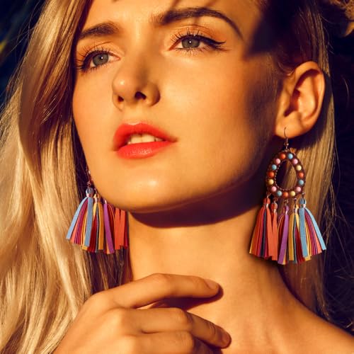 Long Bohemian Fringe Leather Earrrings Handmade Tassel Earrings with Turquoise Vintage Boho Long Dangle Earrings for Women rodeo jewelry 2