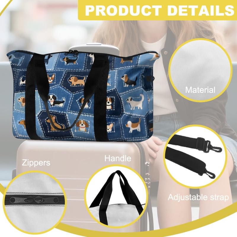 More information about Denim Patchwork Art Foldable Travel Duffel Tote Bag, Cartoon Puppy Dogs Weekender Bag Carry On Tote Bags for Women, Large 30L