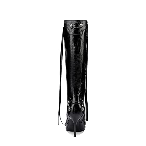 keleimusi Metal Studs Knee High Boots for Women Pointed Toe Heeled Ruffle Leather Shoes 6
