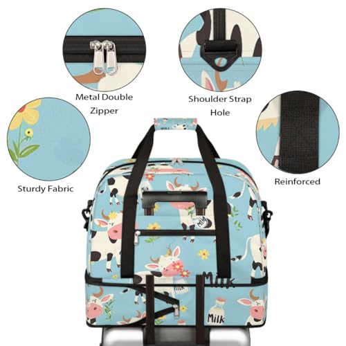 Foldable Carry On Bag for Travel, Expandable Duffle Bag with Shoe Compartment, Flower Cute Cow Lightweight Sports Gym Tote with Trolley Sleeve
