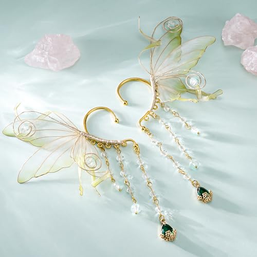 HOT ! FRESHME Fairy Elf Ear Cuffs - Butterfly Wings Elven Ear Cuffs with Glass Beads Tassel Non Pierced Mermaid Ears for Women