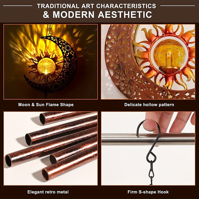 Solar Wind Chimes  Outdoor Light Moon Sun Star Lamp Wrought Iron Sun Lawn Flood Light Patio Outdoor Garden Decoration Waterproof Warm White Light 18