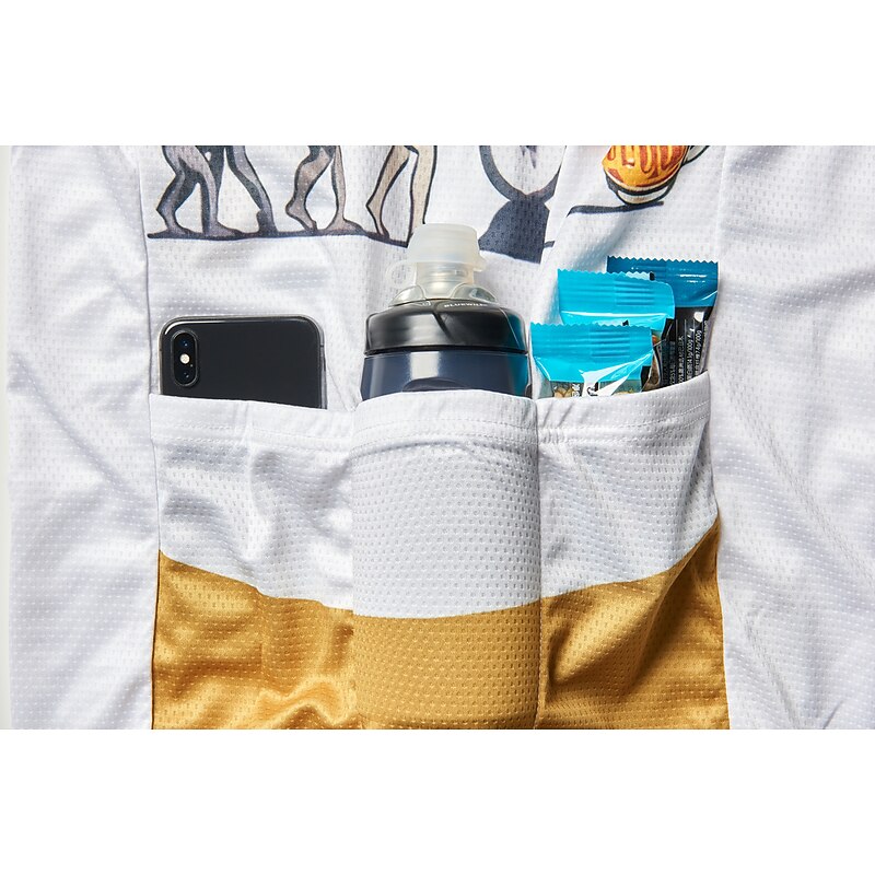 Highlights - Classic 3-pockets design allows you to store essentials like wallet, maps and snacks, ensuring you have everything you need on your ride. - Quick-dry fabric with breathable wicking technology keeps you dry and comfortable during your cycling session, even on hot days. - Anti-slip silicone hem and high elastic tricot fabric provide a secure fit that stays put while you pedal, preventing any sliding or bunching up. - Reflective strip enhances your visibility, keeping you safe when cycling in low light conditions and reducing the risk of accidents. - Designed specifically for men, with micro-elastic fabric ensuring a comfortable and flexible fit no matter your body type. - Featuring an eye-catching evolution pattern perfect for any mountain biking, road cycling or triathlon adventure.