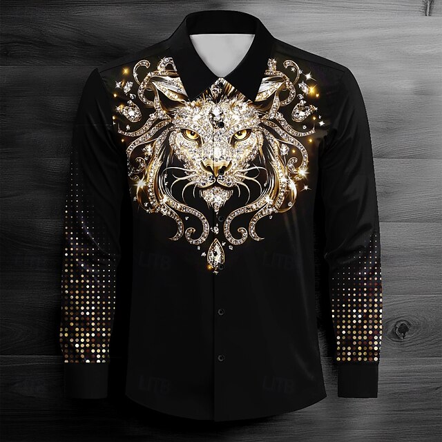 trending ! Men's Lion Collared Shirt Button Up Shirt Long Sleeve Dark Causal Casual Spring Fall Turndown Button Up Black Yellow Blue