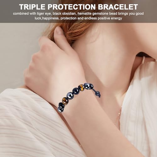 HOT ! 2PCS Triple Protection Bracelet, Tiger Eye Bracelet for Men and Women Black Hematite and Obsidian 10mm Crystal Beads Bracelet Handmade Gifts for Luck Prosperity