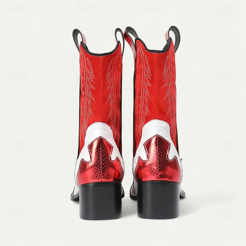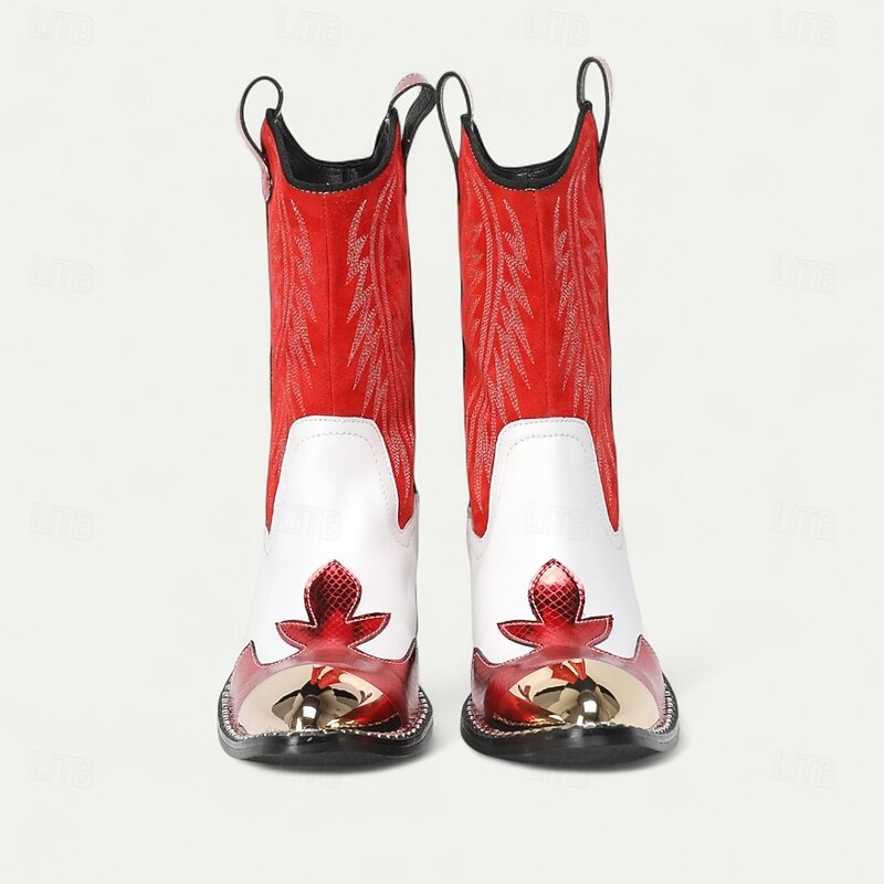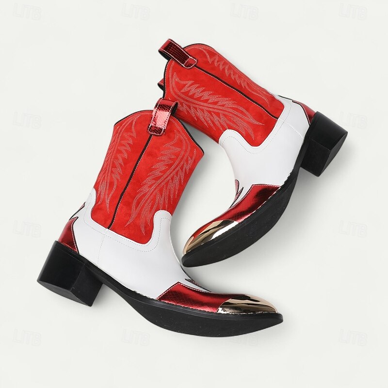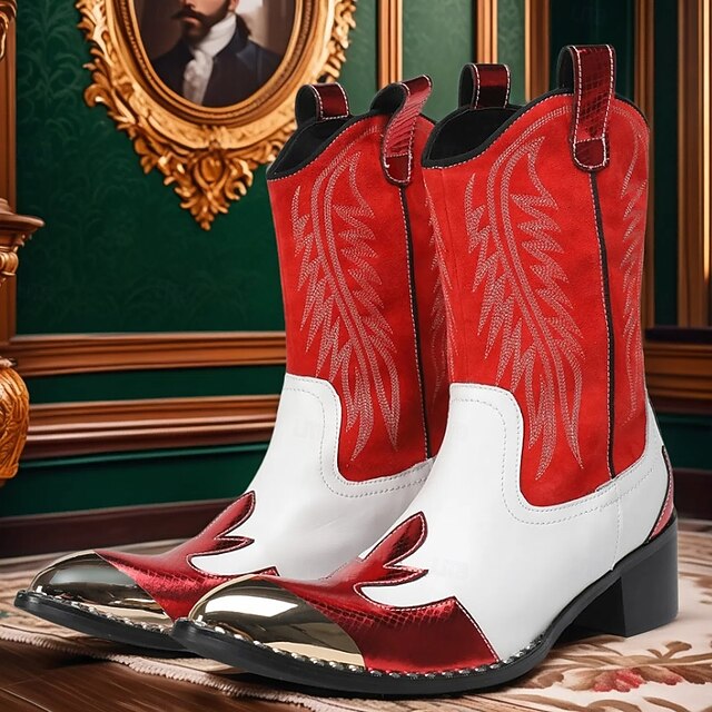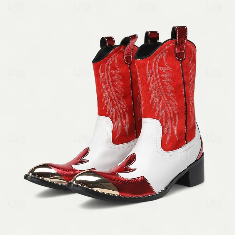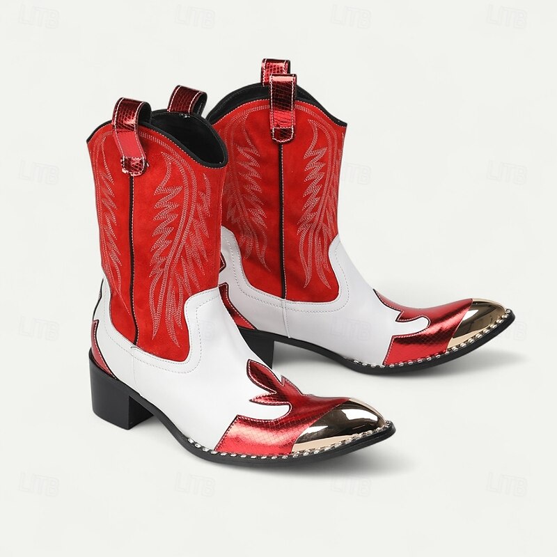 HOT ! Men's Red and White Leather Western Cowboy Boots–Bold Contrast Design with Gold Tip Classic Stitching, Statement Footwear for Country Events and Themed Parties