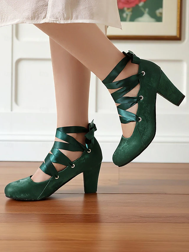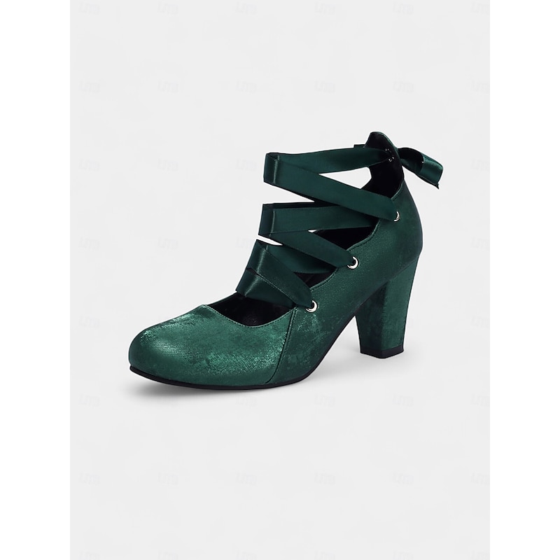 Women's 1920s Vintage Gatsby Green Satin Lace-Up Heeled Mary Jane Shoes-Retro-Inspired Chunky Heel Shoes for Tea Parties or Vintage Gatsby Outfits 1