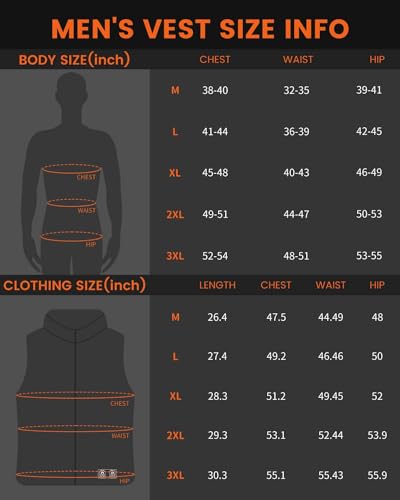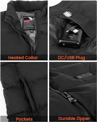 • 11 Heated Zones and 3 Heating Modes: The men's heated vest is equipped with 11 carbon fiber heating zones, including neck and back, and two pockets. Warm your whole body. Adjust different parts through 3 control buttons. There are 3 different levels (High, medium, and low). The DC plug helps to fast charge, and quickly heat in seconds