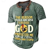 Why Choose Mens Green Short Sleeve Henley Graphic T-Shirt, Funny 'Old & Wise Because God Protected Me When Young & Stupid' Quote Humor Top?