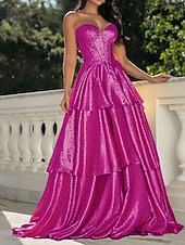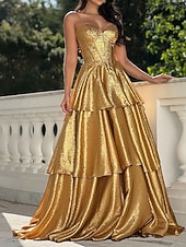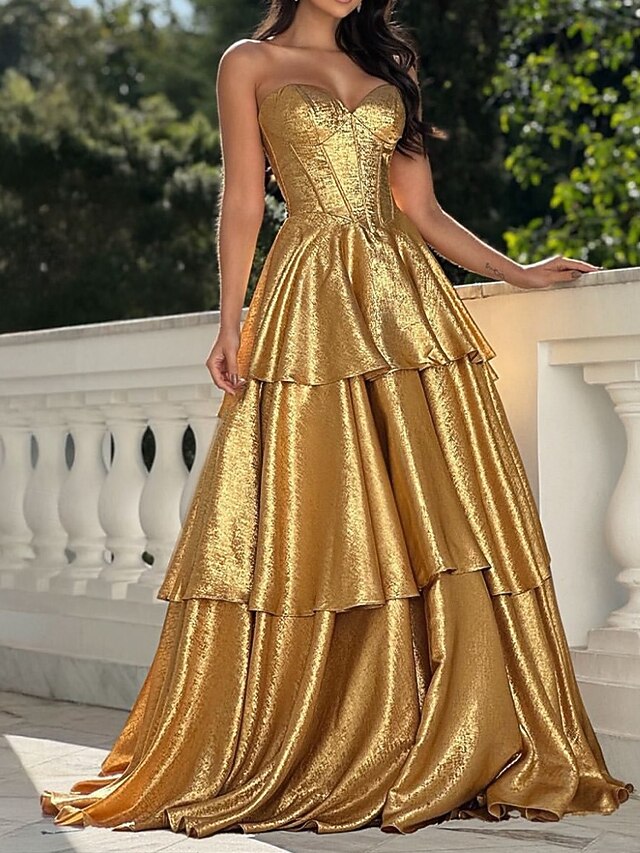 More information about A-Line Gold Tiered Evening Gown Elegant Dress Formal Wedding Sweep / Brush Train Sleeveless Sweetheart Tulle with Ruffles 2025