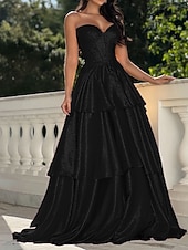HOT ! A-Line Gold Tiered Evening Gown Elegant Dress Formal Wedding Sweep / Brush Train Sleeveless Sweetheart Tulle with Ruffles 2025