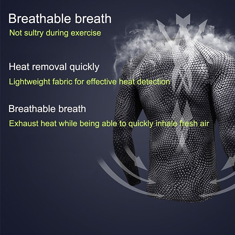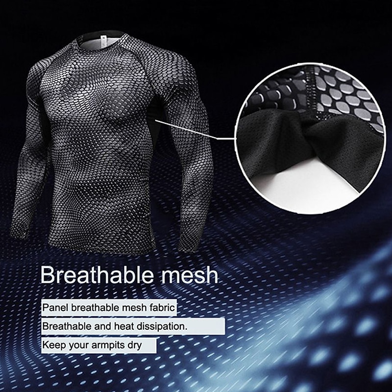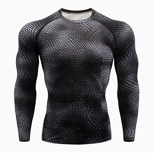 Highlights [Fabric] : Crafted from a high-performance polyester and spandex blend, this men's compression shirt offers exceptional stretch and durability. Its moisture-wicking and breathable properties ensure you stay dry and comfortable during intense workouts or athletic activities. [Fit] : This gym shirt features a slim-fit design that contours to the body, providing a supportive feel for optimal performance. The micro-elastic fabric guarantees flexibility without compromising on comfort. [Design Highlights] : The shirt showcases a striking snake-skin print that sets it apart, coupled with a crew neck for a sleek and modern look. The long sleeves add to its athletic appeal, making it suitable for a sporty lifestyle. [Occasions] : Perfect for sports and outdoor activities, this versatile shirt is also suitable for vacation, casual outings, and daily wear. It seamlessly combines functionality and style for an active and fashionable wardrobe staple. [Size Range] : Available in a broad range of sizes—S to 3XL—this compression shirt caters to a variety of body types, ensuring a comfortable fit for everyone. Colors include Blue, White, Black, Red, and Grey.