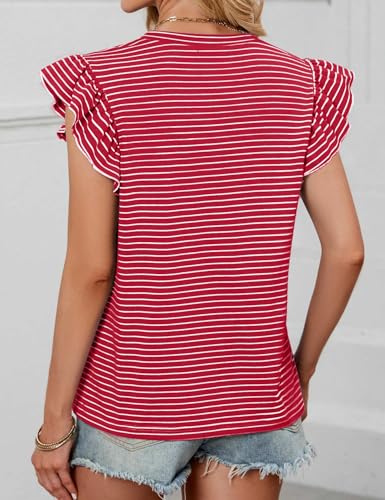 JUSTFASHIONNOW Womens Summer Tops Striped T-Shirts 2025 Ruffle Short Sleeve Crew Neck Casual Blouses with Pocket 4