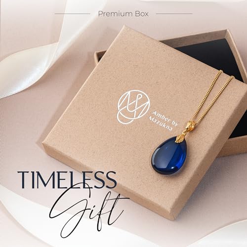 More information about Blue Amber Pendant Necklace for Women, Gold Plated Sterling Silver Chain, Dark Blue Gemstone Drop Pendant, Dainty Ladies Jewelry