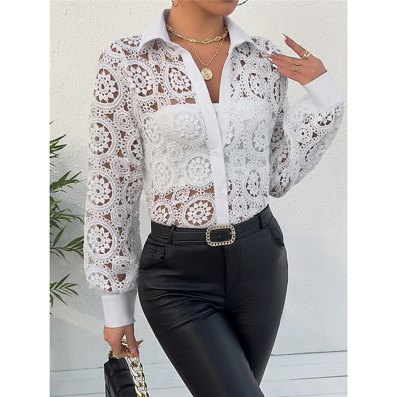 Highlights [Fabric] : Crafted from high-quality polyester, this women's blouse features an intricate white lace design with a delicate circular crochet pattern throughout. The fabric is micro-elastic, ensuring comfort and ease of movement. [Fit] : The blouse maintains a classic, tailored silhouette with a regular fit, accented by a crisp, pointed collar and a button-front closure that provides structured elegance. The slightly flared long sleeves add a touch of femininity. [Design Highlights] : This blouse is adorned with beautiful lace and patchwork details, offering a modern twist with its transparent appearance. It features decorative buttons and a stylish V-neckline that enhances its chic appeal. [Occasions] : Perfect for daily wear and going out during the spring and fall seasons, this versatile blouse suits both casual and formal settings. Whether it's a day at the office or a casual lunch, this top adds a touch of elegance and style to any outfit. [Size Range] : Available in a wide range of sizes, this blouse comes in S, M, L, XL, and 2XL, making it accessible for different body types.
