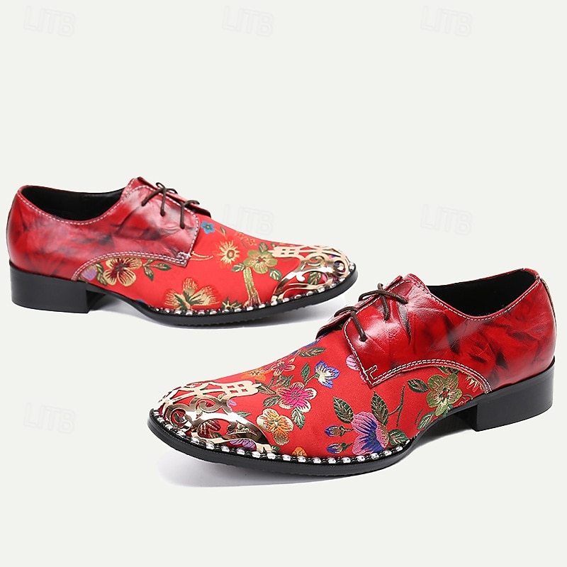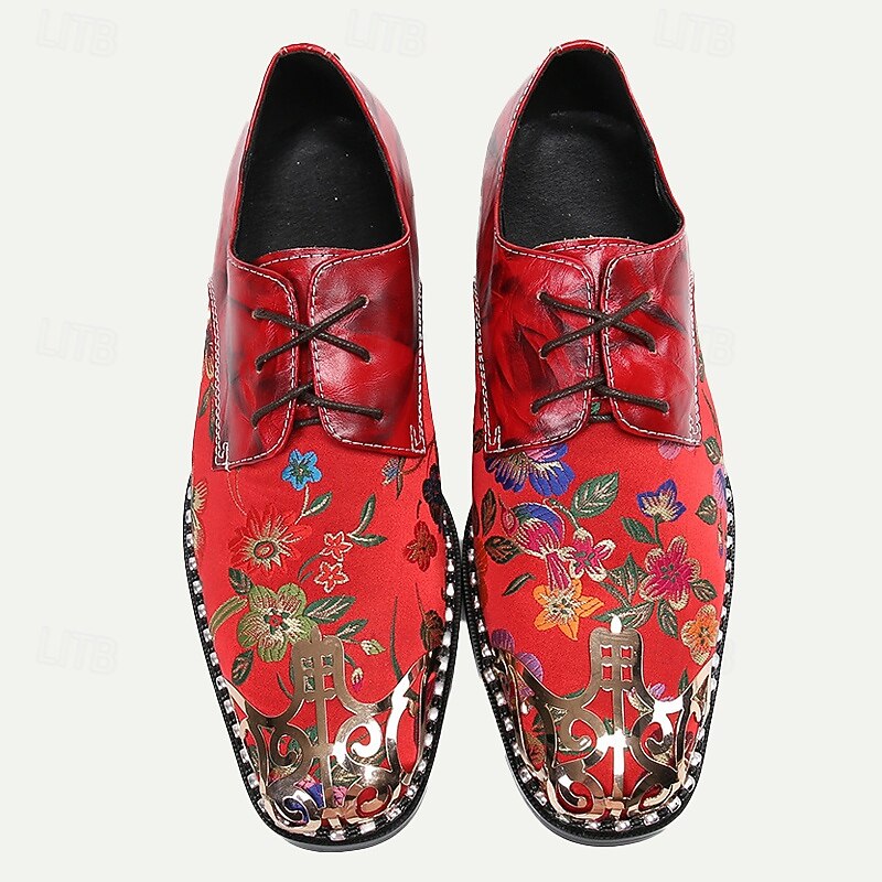 Men's Red Floral Lace-Up Oxford Shoes – Premium Cowhide Leather with Metal Toe Cap, fashionable Design for Weddings, Parties, and Special Occasions