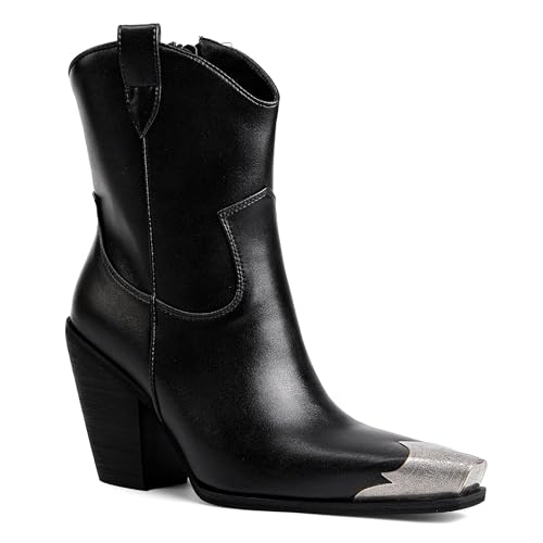 Arqa Women's Western Boots Etched Metal Toe Cowgirl Booties Stacked Block Heel Ankle Boots Side Zipper Vintage Cowboy Boot 6