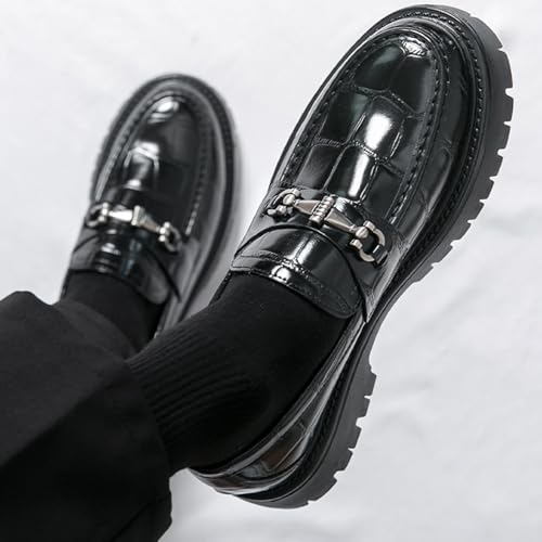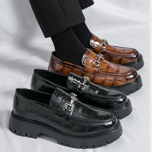 Mens Patent Leather Slip-On Platform Dress Leather Printed Platform Penny Loafers Fashion Round Toe Metal Decoration Non-Slip Thick Sole Business Dress 7
