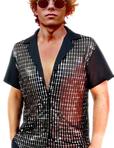 More information about Mens Mesh Sequins See Through 70s Disco Long Sleeve Button Down Shirts