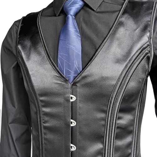 • Note:This is not The USA size, kindlpy please refer to the size chart picture in the page Material Composition:The corset vest for men,its fabric undergoes a composite process, making the vest more sturdy and stylish,with exquisite workmanship,V neck,6 metal buckles, laces up at back, 12 bones, Chic black showing elegant for gentlemen wear. This dress waiscoat is idea choice for any outfits and shirts