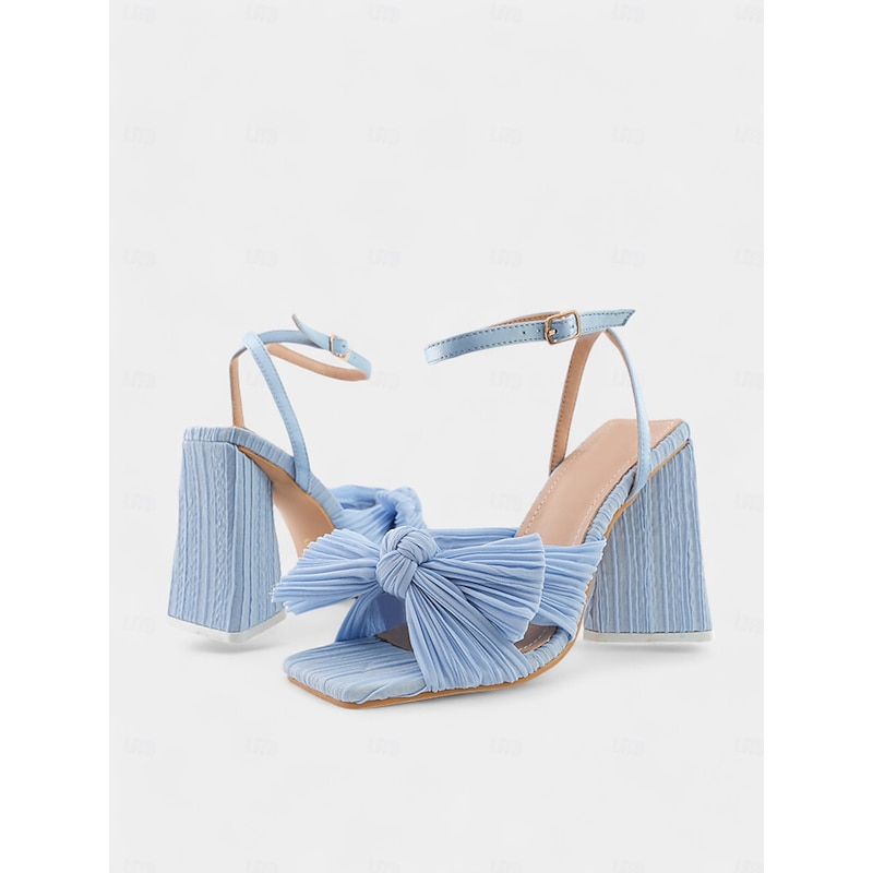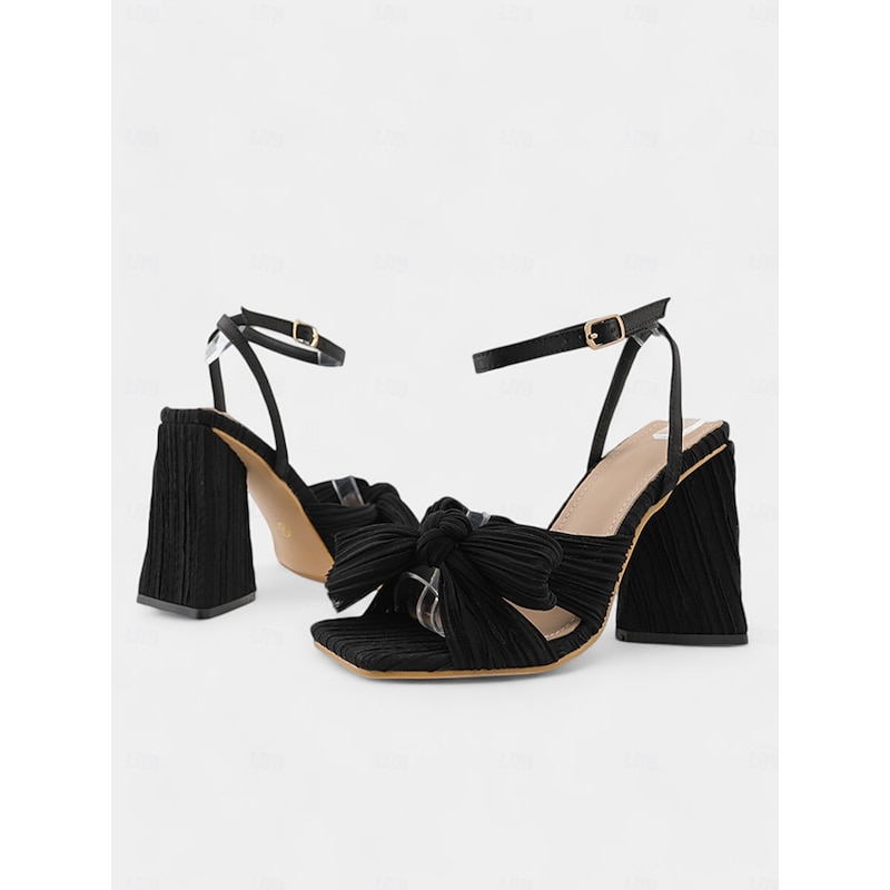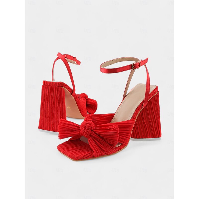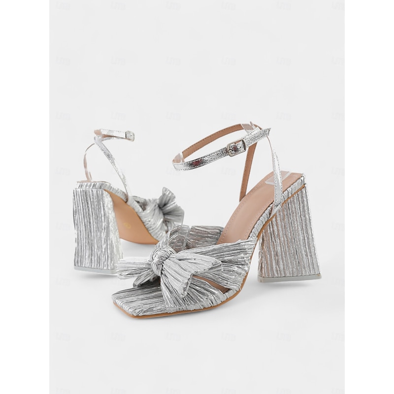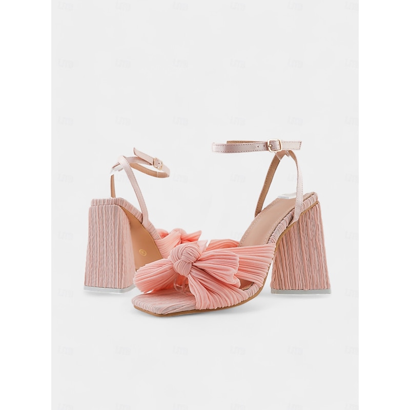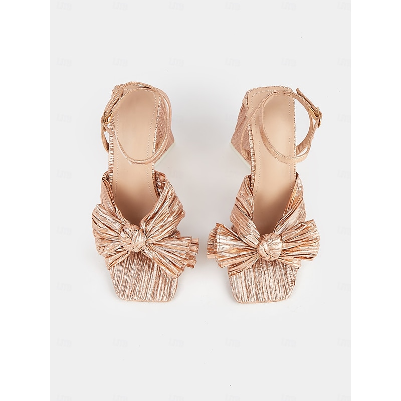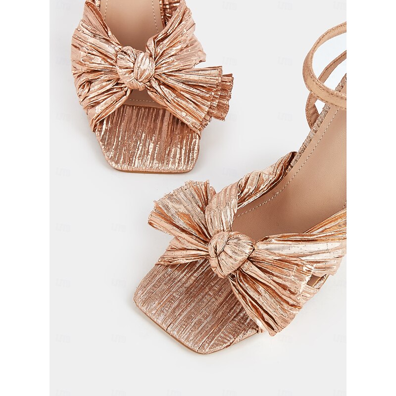 Highlights [Fabric] : Crafted from high-quality satin, these sophisticated women's sandals showcase a shimmering rose gold finish that embodies elegance and luxury. The metallic material is not only visually captivating but also ensures comfort and durability. [Silhouette] : These sandals offer a balanced silhouette with their chic open-toe design and secure ankle strap with buckle closure. The inclusion of a block heel adds height while maintaining stability, making them suitable for long hours of wear. [Design Highlights] : The sandals feature a stylish crinkle texture on both the straps and heels, adding a unique and trendy touch. A charming bowknot embellishment graces the front, enhancing the overall aesthetic with a playful yet refined flair. [Occasions] : Perfect for weddings, bridal showers, evening events, and other special occasions. These sandals elegantly complement various outfits, from classy dresses to casual jeans, making them a versatile addition to any wardrobe. [Size Notice] : Available in a range of sizes from US5.5 to US10.5, these sandals are designed to fit true to size. Select your usual size for the best fit.