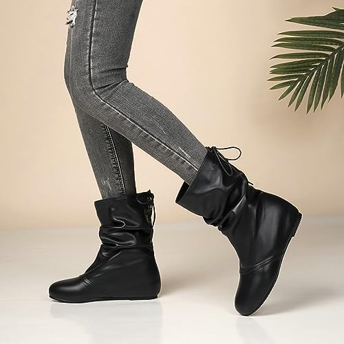 HOT ! Women's Pleated Lace Up Flat Mid Calf Boots,Fashion Soft Leather Low Hidden Wedge Boots Comfort Slip On Non-slip Classic Riding Booties Casual Fall Winter Walking Travel Shoes