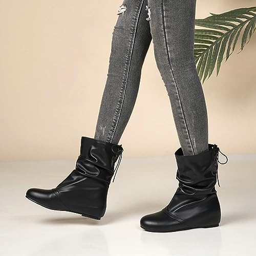 More information about Women's Pleated Lace Up Flat Mid Calf Boots,Fashion Soft Leather Low Hidden Wedge Boots Comfort Slip On Non-slip Classic Riding Booties Casual Fall Winter Walking Travel Shoes