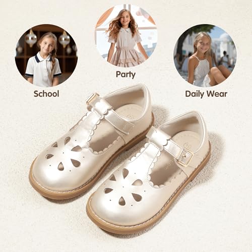 • T-strap and Flower Hollow Design Toddler Shoes: Cute T-strap with buck decoration Design and flower hollow on the upper add more stylish sense for the flower girl shoes. Wear toddler mary jane shoes, gain both practical and beauty