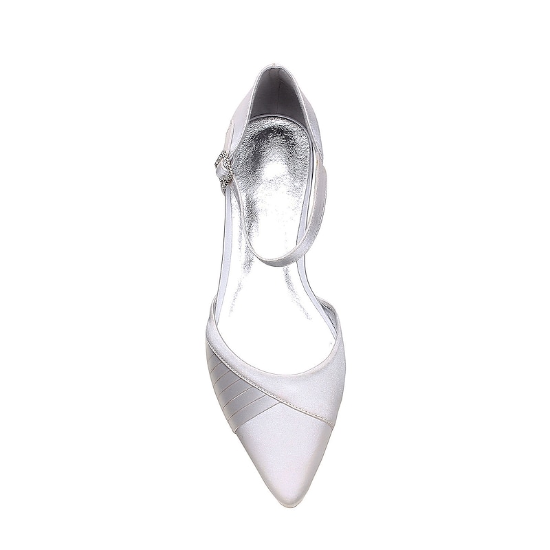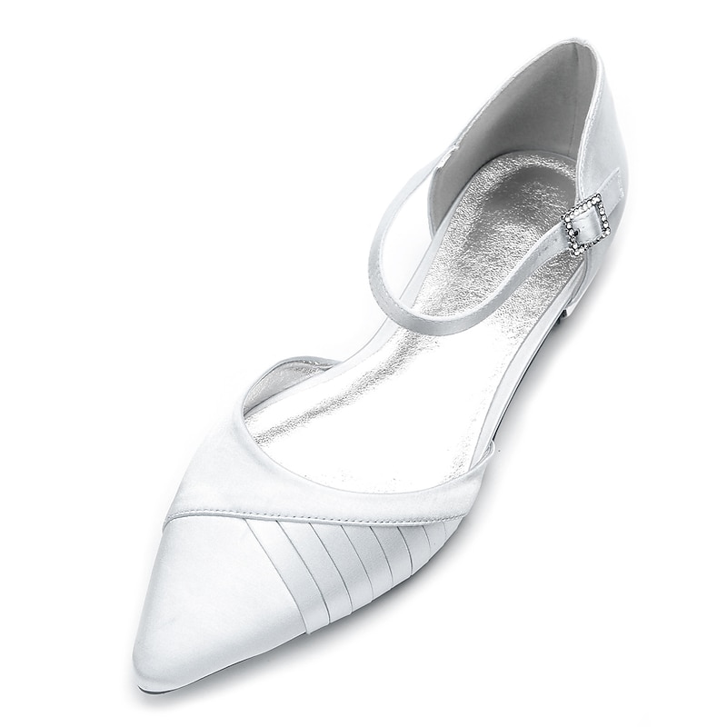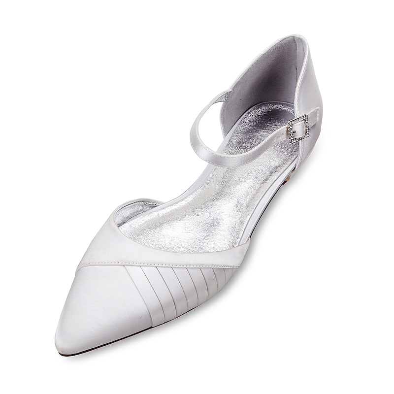 Highlights [Fabric] : Crafted from luxurious satin for a smooth, lustrous finish, these wedding flats offer a sophisticated touch to any ensemble. The satin upper material ensures a polished look, while the PU lining provides additional comfort. [Silhouette] : Designed with a flattering pointed toe and flat heel silhouette, these shoes emphasize both style and comfort. The D'Orsay cut adds an elegant twist, making it a versatile choice for formal occasions. [Design Highlights] : Featuring a delicate ankle strap with a ribbon tie and a decorative buckle, these shoes provide a secure fit while adding a touch of glamour. The interior is lined with a soft, metallic-toned material that enhances both comfort and style. [Occasions] : Perfect for weddings, parties, evening events, and any special occasion. These flats serve as an elegant choice for brides, bridesmaids, or guests, ensuring style and comfort throughout the event. [Size Range] : Available in a variety of sizes including US 5.5 to US 11.5, catering to different preferences and ensuring a comfortable fit for many.