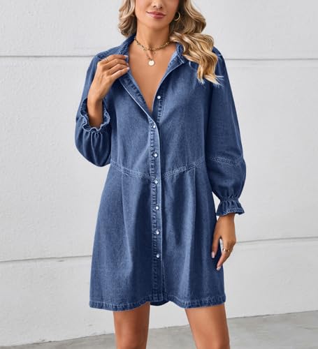 chouyatou Women's Button Down Denim Shirt Dress Lantern Long Sleeve Tiered Baydoll Jean Mini Dress 7