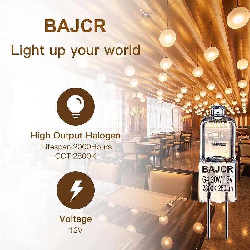 More information about BAJCR G4 Halogen Bulb 20W, 10 Pack Dimmable G4 Light Bulb for Under Cabinet Puck Light, Chandeliers, Track Lighting, AC/DC 12 Volt, T3 JC Type Bi-Pin G4 Base, Warm White 2800K