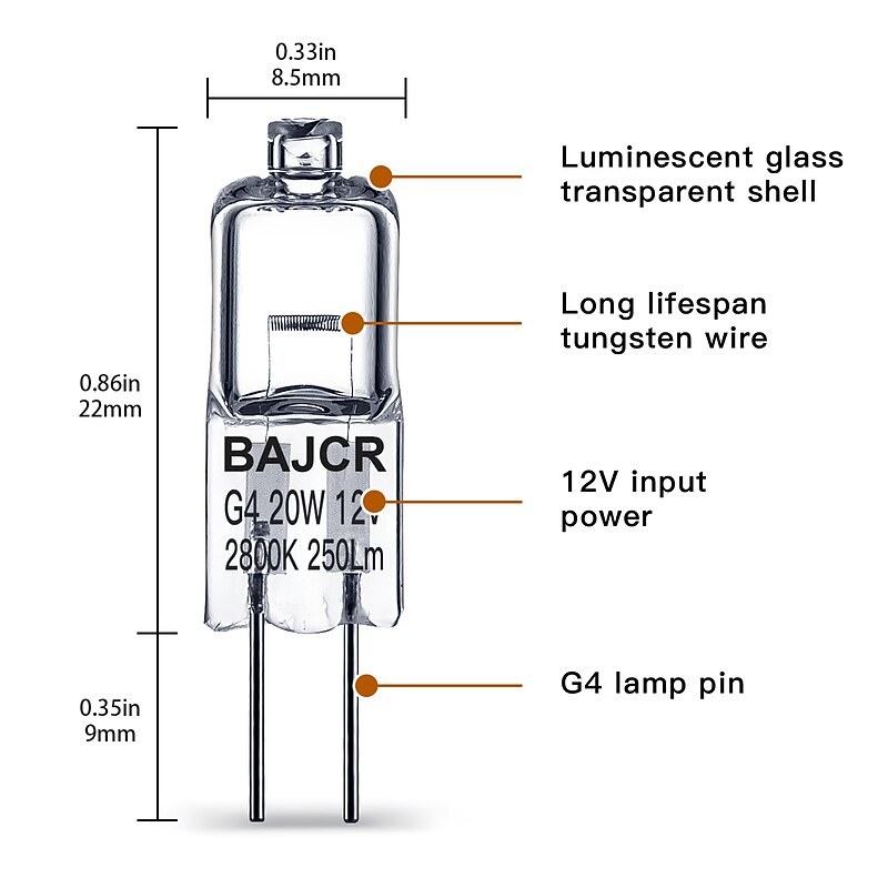 $8.99 - BAJCR G4 Halogen Bulb 20W, 10 Pack Dimmable G4 Light Bulb for Under Cabinet Puck Light, Chandeliers, Track Lighting, AC/DC 12 Volt, T3 JC Type Bi-Pin G4 Base, Warm White 2800K 2025. Shop for cheap LED Bi-pin Lights online? Buy at lightinthebox.com on sale today!