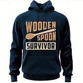 : The hoodie showcases a bold graphic letter print with the phrase "Wooden Spoon Survivor," adding a touch of humor and personality. The adjustable drawstring hood provides a customizable fit, while the 3D print technology ensures vibrant and lasting colors.