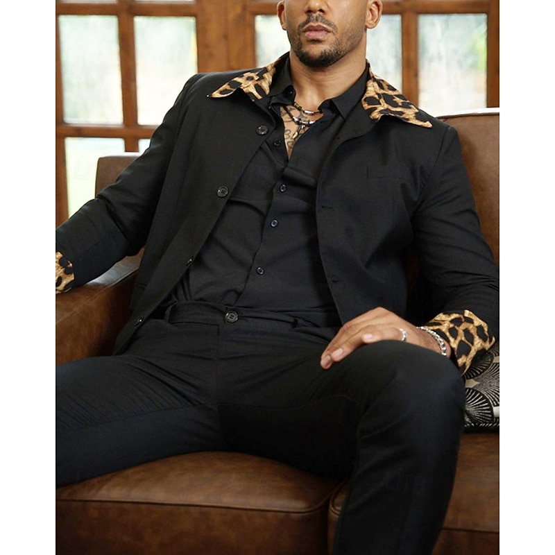 Men's Blazer Business Cocktail Party Wedding Party Fashion Casual Spring &  Fall 65% Cotton Leopard Pocket Buttons Comfortable Single Breasted Blazer Black 7