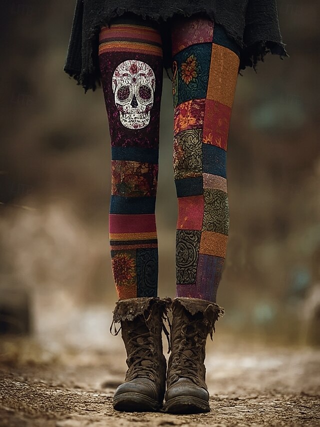 Women's Leggings Vacation Vintage Ethnic Style Ankle-Length High WaistPantsHalloween Graphic Skull Monster 3D Print Quick Dry Breathability Soft Stretchy Outdoor Home Causal Blue Orange Green Khaki 10