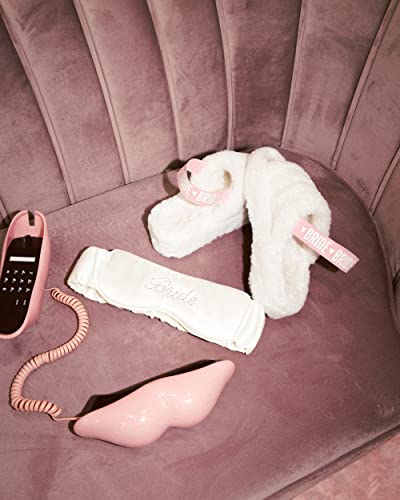• Cool Bride: keep it cool in our white faux fur platform slippers featuring a white "BRIDE" logo on comfy pink elastic.