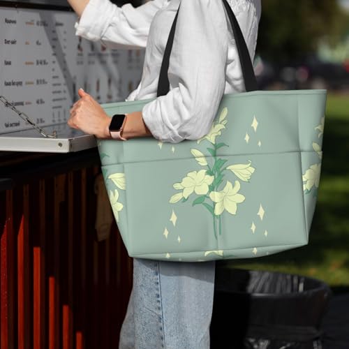 Cartoon white lilies Printed beach travel bag, perfect for shopping bags, swimming pools, gyms, travel shopping, large capacity beach bag with zipper, 6