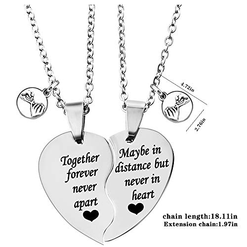 • Basic Information: Material: stainless steel; Size: Length of the necklace is 18 inches; Form: 2PCS Split heart engraved TOGETHER FOREVER NEVER APART, MAYBE IN DISTANCE BUT NEVER IN HEART necklaces